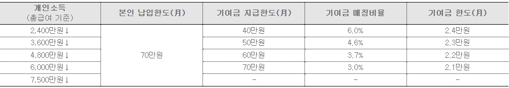 개인소득 총 급여 4,800만 원 이하인 경우 월 70만 원 납입한도에 미치지 못하는 월 40 ~ 60만 원을 납입하더라도 정부기여금을 모두 수령할 수 있도록 기여금 지급한도를 별도로 설정하였습니다.